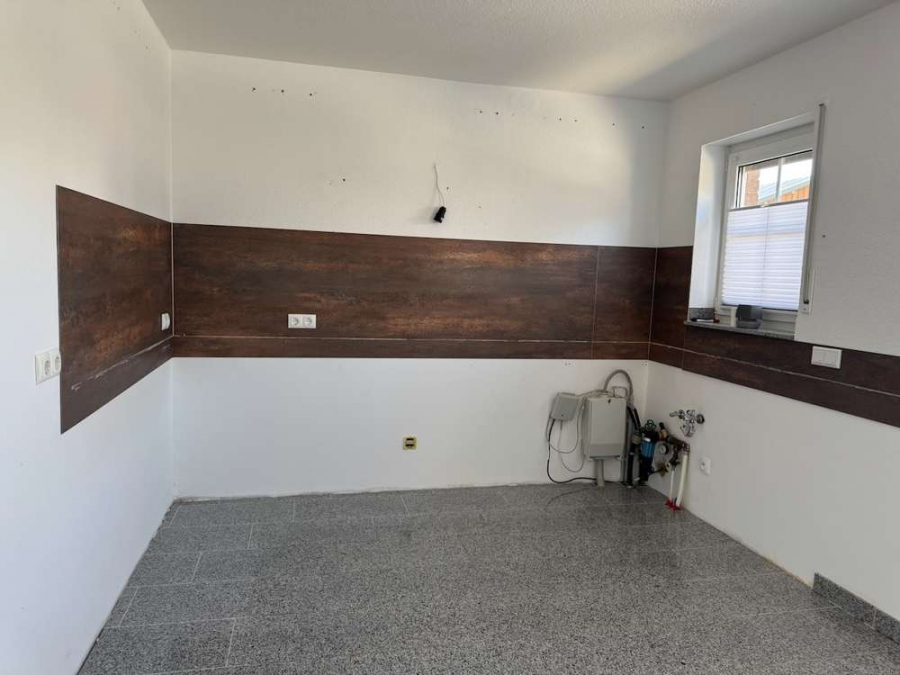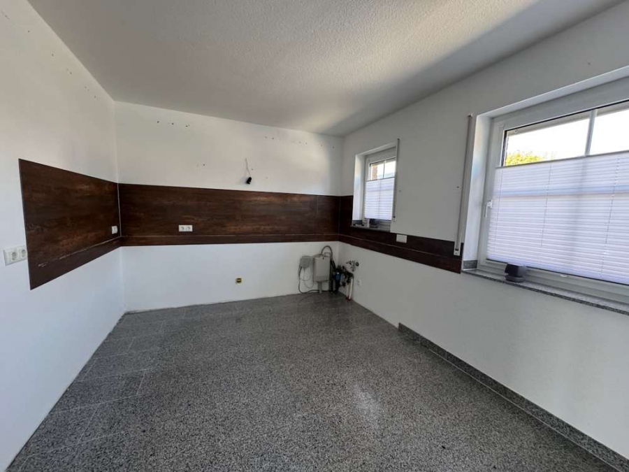 Der helle und einladende Eingangsbereich wurde 2019 durch eine neue Haustür modernisiert. Von der Diele aus gelangt man in das gepflegte Gäste-WC mit Fenster, Waschtisch und Rollladen sowie in die großzügige Wohnküche mit gemütlichem Essplatz. Zwei große Fenster sorgen hier für viel Tageslicht, alle Fenster sind mit Rollläden ausgestattet. Ein TV-Anschluss in der Küche ist ebenfalls vorhanden.