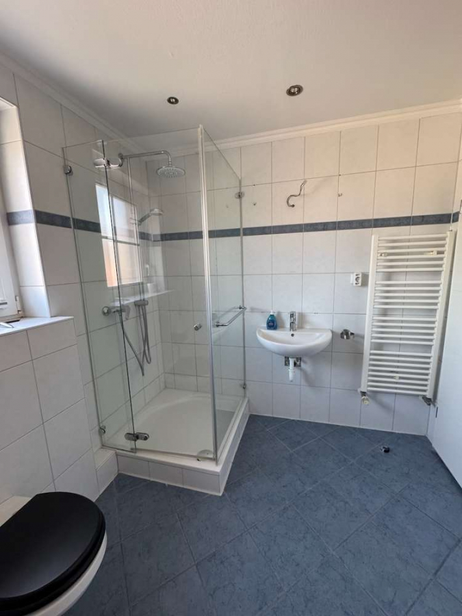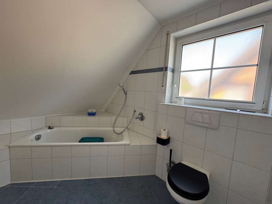 Im 1. Obergeschoss befindet sich ein großzügiges Tageslichtbad mit Dusche (Glasabtrennung), Badewanne, WC, Waschbecken und Platz für Waschmaschine und Trockner – ideal, da die Wäsche auf derselben Ebene anfällt. Weiße Fliesen, Einbauspots und ein Fenster mit Rollladen runden das Bild ab. Ebenfalls auf dieser Etage: ein Elternschlafzimmer mit Parkett, Gaubenfenster und Ankleidenische sowie zwei weitere helle Kinderzimmer mit Parkett und Gauben- bzw. Veluxfenster. Das ausgebaute Dachstudio (ca. 22 m²) wird aktuell als Elternbereich genutzt, verfügt über ein großes Giebelfenster mit Zugang zum Rettungsbalkon, eine Klimaanlage mit Heizfunktion (2020) und hochwertigen Teppichboden. Erreichbar ist es über eine moderne Stahl-Designtreppe (2022).