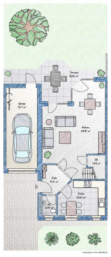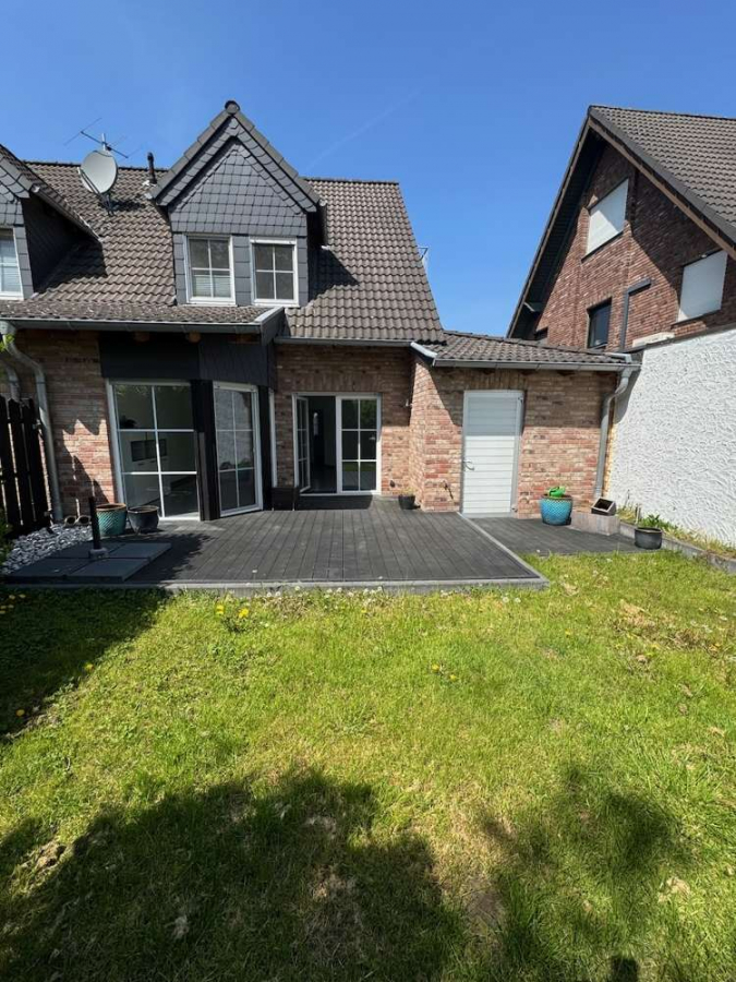 Der gepflegte, eingezäunte Garten ist ideal für Familien und bietet Platz für Spielgeräte. Ein Zugang durch die Garage ermöglicht eine bequeme Erreichbarkeit von außen.