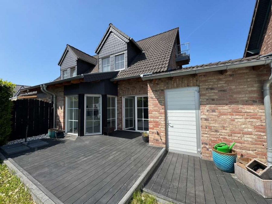Ein besonderes Highlight ist die großzügige, aufwendig gestaltete Sonnenterrasse mit pflegeleichten WPC-Dielen, die viel Raum für Erholung im Freien bietet.