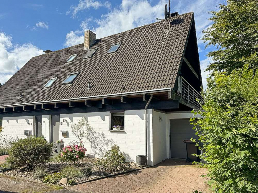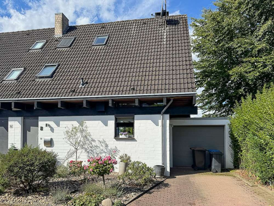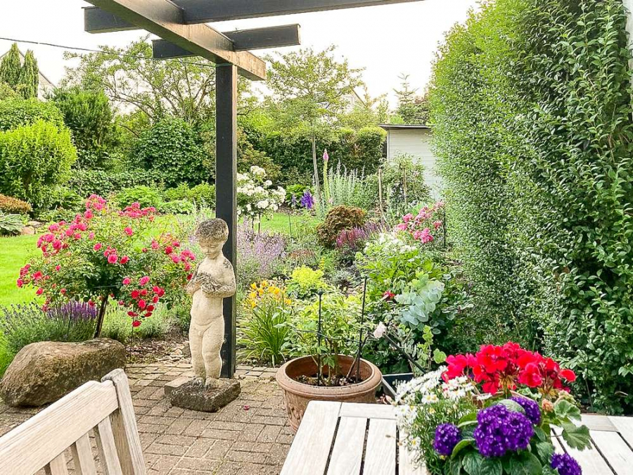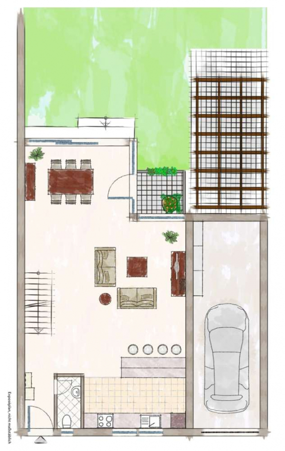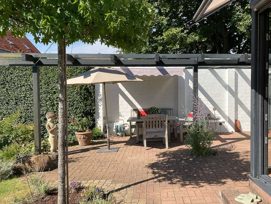 An den Wintergarten schließt sich eine gepflasterte Terrasse sowie der Garten an. Diesen erreichen Sie ebenfalls über die Garage, welche sich direkt am Haus befindet und einen weiteren PKW-Stellplatz vor der Garage bietet.