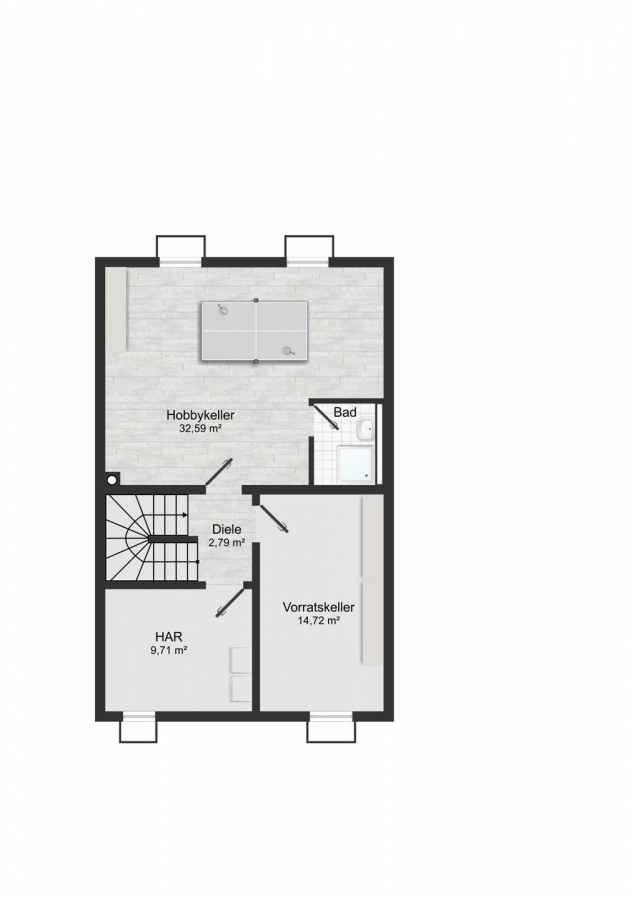 Das Kellergeschoss bietet zusätzliche Nutzfläche mit vielseitigen Nutzungsmöglichkeiten, darunter ein großer Hobbyraum sowie ein weiteres Badezimmer. Die Bauweise mit weißer Wanne sorgt für einen zuverlässigen Feuchtigkeitsschutz.