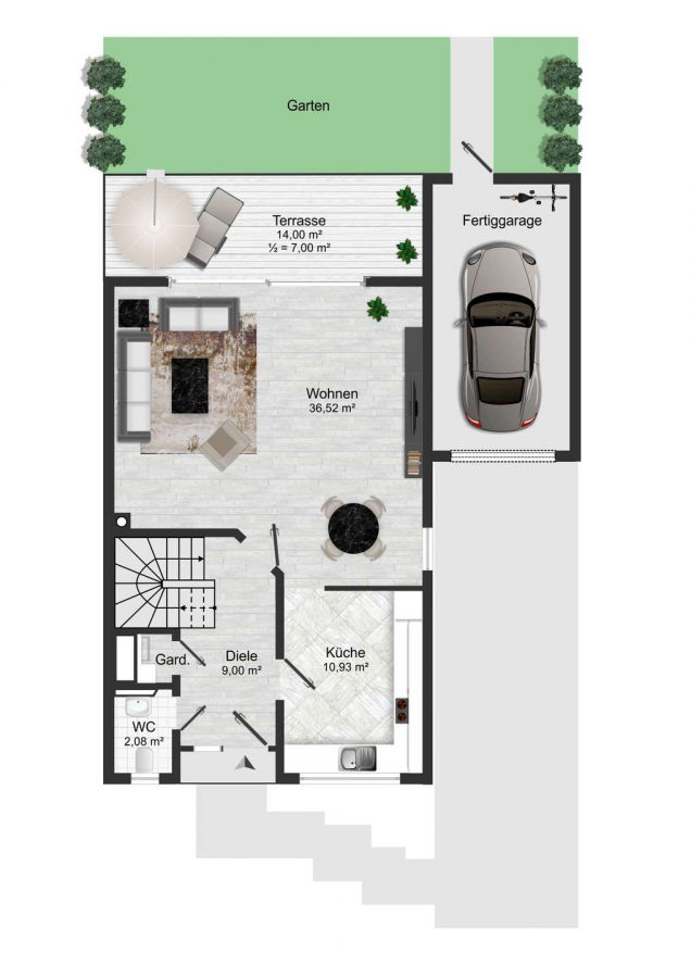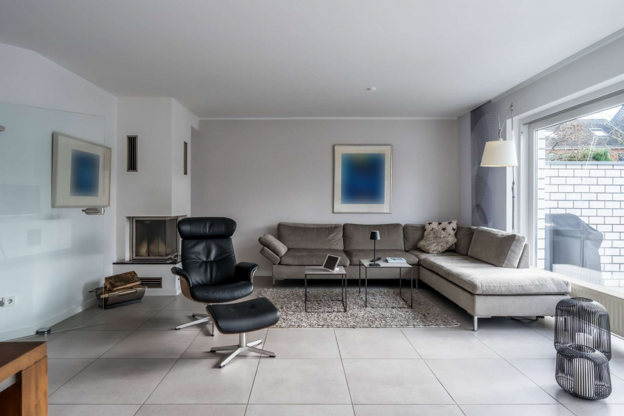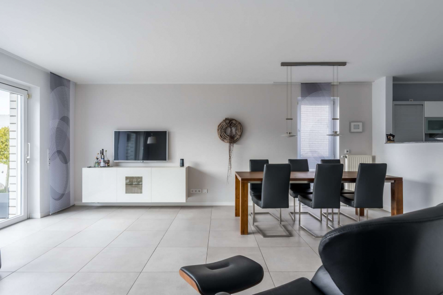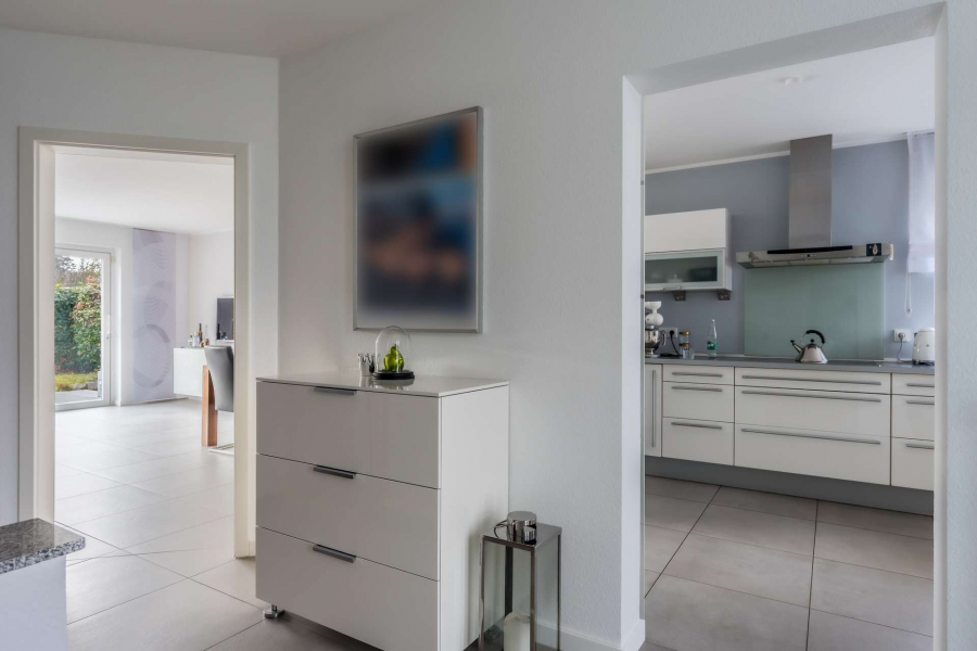 Bereits beim Betreten des Hauses empfängt Sie ein heller, einladender Eingangsbereich. Herzstück des Hauses ist der offen gestaltete Wohn- und Essbereich mit breiter Terrassenschiebetür und direktem Blick in den liebevoll angelegten Garten. Der moderne Kamin sorgt hier für eine besonders angenehme Wohnatmosphäre.