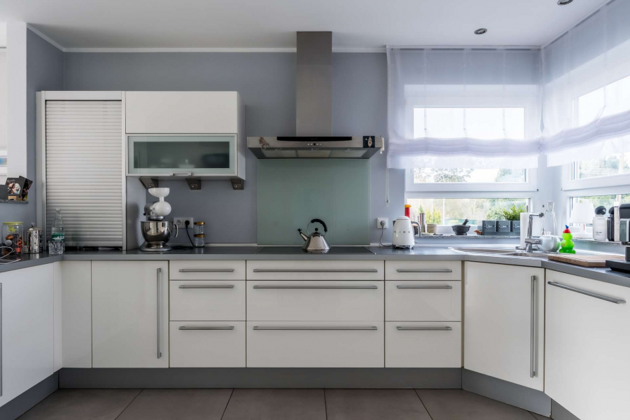 Die halboffene Küche mit Eckfenster ist lichtdurchflutet und funktional gestaltet. Das Erdgeschoss wurde im Jahr 2022 umfassend renoviert und präsentiert sich in einem modernen, gepflegten Zustand.