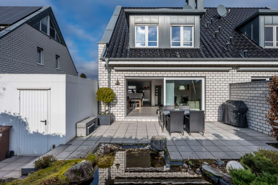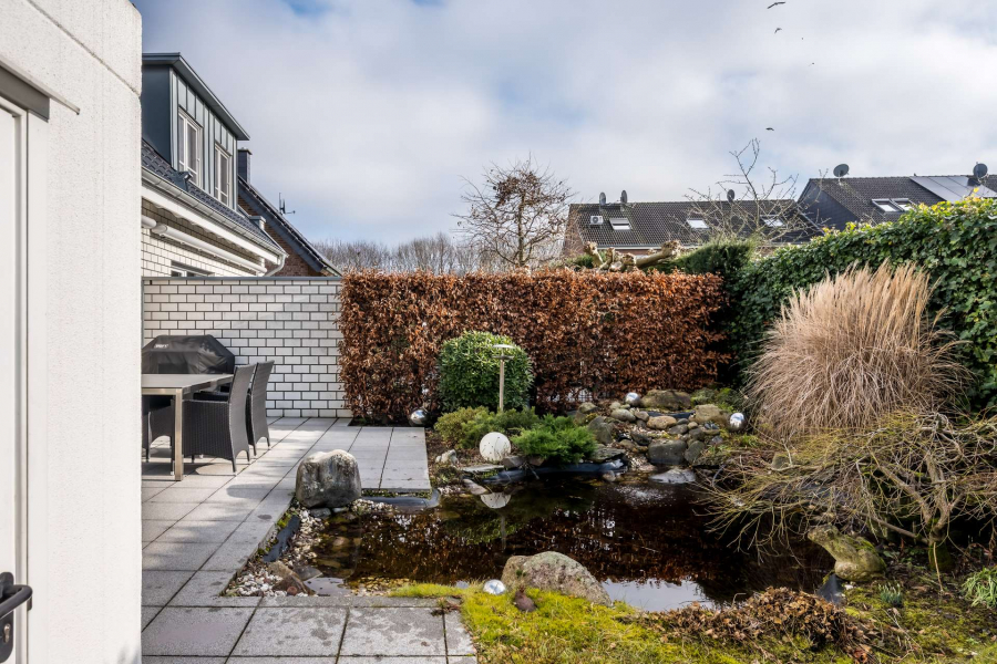Ein gepflegter Garten mit großzügiger Terrasse, hochwertiger Markise sowie einer stilvollen Teichanlage schafft eine besondere Wohnqualität mit hohem Erholungswert.