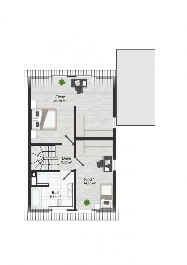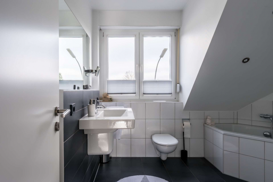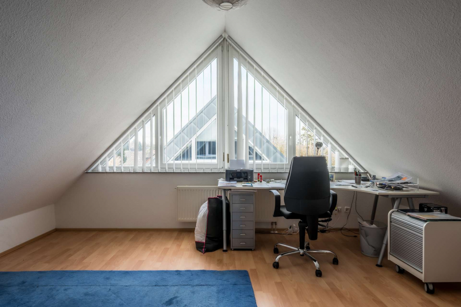 Im Obergeschoss befinden sich das großzügige Elternschlafzimmer mit Ankleidebereich sowie ein komfortables Tageslichtbad mit Badewanne und Dusche. Weitere Räume stehen im Dachgeschoss zur Verfügung und eignen sich ideal als Kinder-, Gäste- oder Arbeitszimmer.