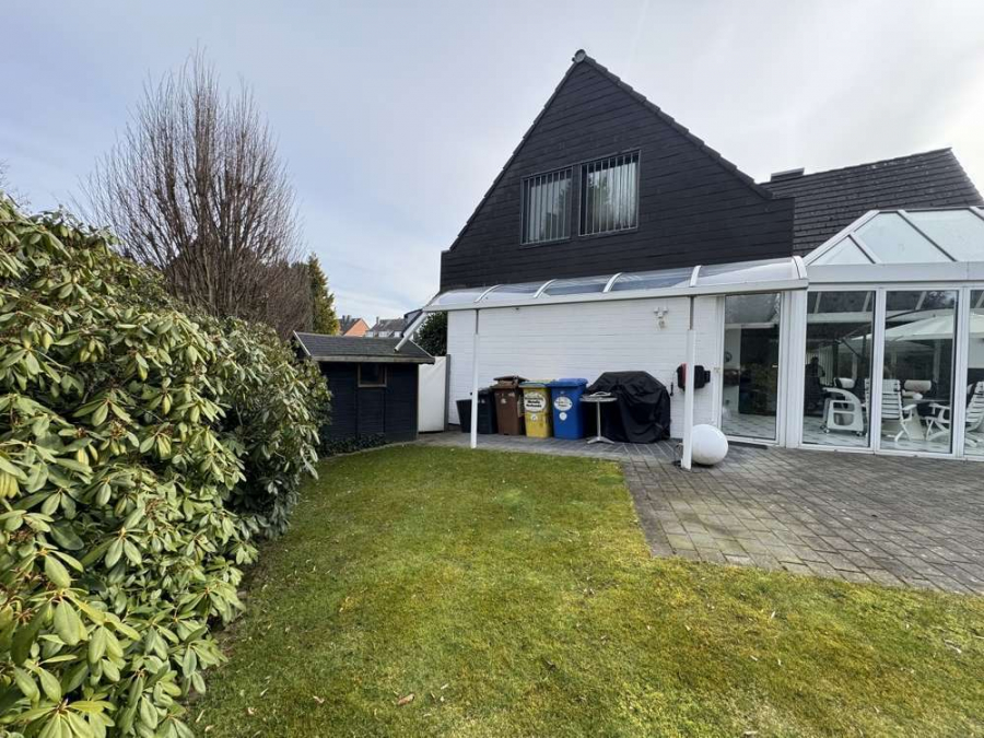 Der gepflegte Garten ist nahezu uneinsehbar und ideal für entspannte Stunden im Freien. An die großzügige Terrassenfläche schließt sich eine pflegeleichte Rasenfläche an, die von Beeten eingefasst ist.