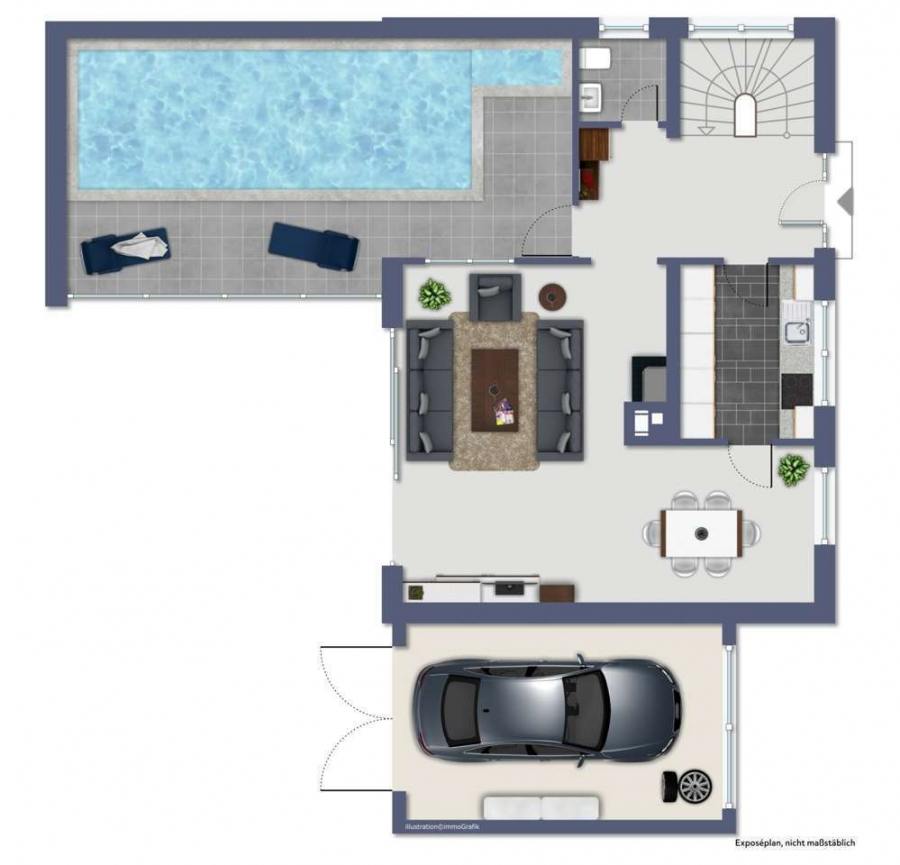 Der offene Wohn- und Essbereich ist hell und einladend. Angrenzend befindet sich ein Wintergarten, der den Blick ins Grüne freigibt. Die separate Küche bietet genügend Platz und schließt sioch an den Essbereich an. Das Highlight dieser Etage ist der 7,30 x 3 m große Indoor-Pool mit Gegenstromanlage – dank großzügiger Verglasung zum Wintergarten wirkt dieser Bereich besonders hell und freundlich.
