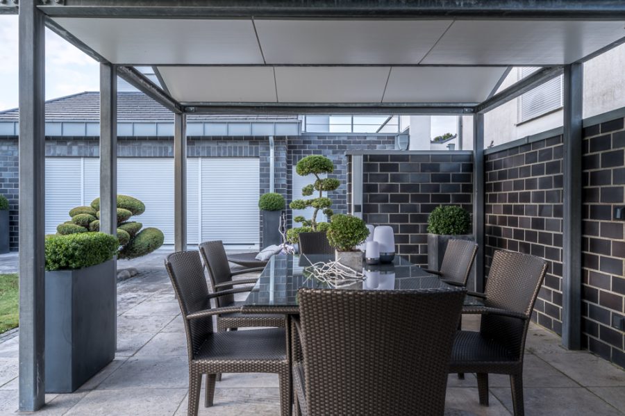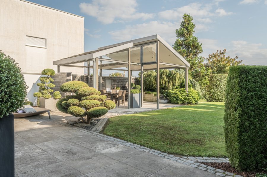 Das Haus und die Garage verfügen über eine interessante Pultdachkonstruktion, welche sich ebenfalls an dem überdachten Freisitz im Garten widerspiegelt.