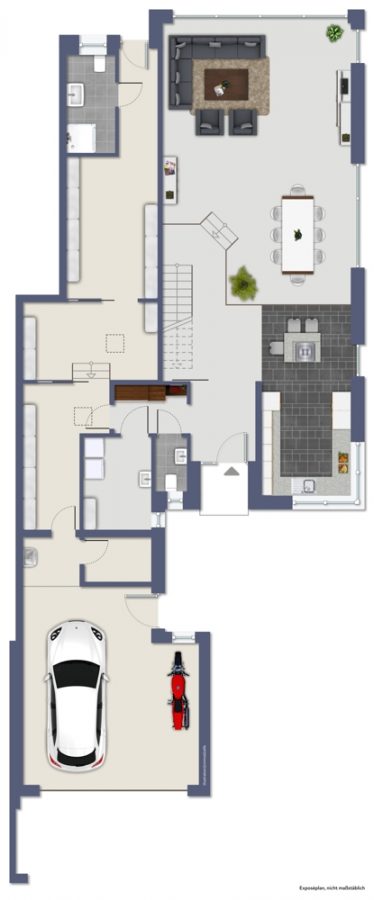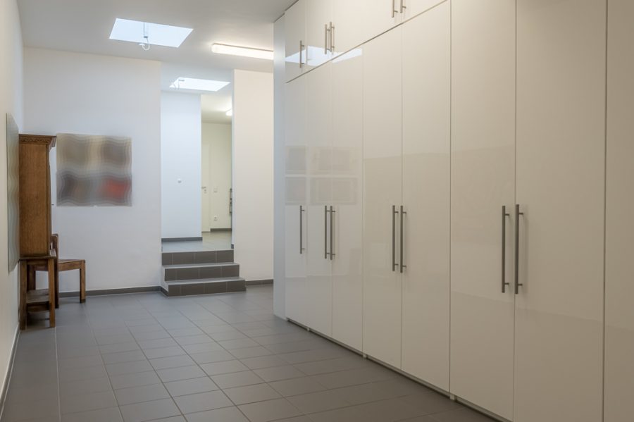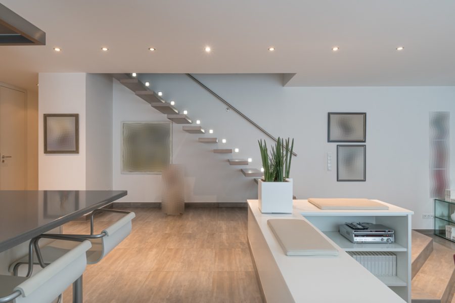 Das Haus ist hochwertig und äußerst geschmackvoll ausgestattet. Die freischwebende Treppe, der höhenversetzte Wohn- / Essbereich, die offene Küche mit Kochinsel und die großen Fensterflächen sind nur einige Highlights des Erdgeschosses. Diverse Einbauschränke, das Lichtkonzept mit Einbauspots und indirekte Beleuchtung runden das Wohnkonzept ab.