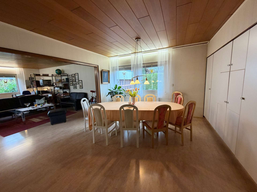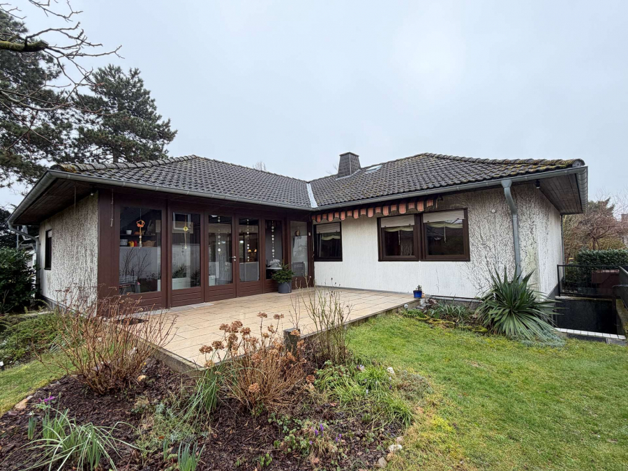 Freistehendes Einfamilienhaus in L-Form, erstellt als Fertighaus der Firma Okal, Baujahr 1976 im Bungalowstil. Die Grundstücksgröße beträgt 619 m².