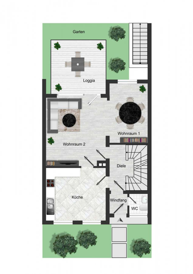 Eine große Terrasse lädt zum Entspannen und geselligen Beisammensein ein. Abgerundet wird das Angebot durch eine Garage, die sich nur wenige Schritte vom Haus entfernt befindet.