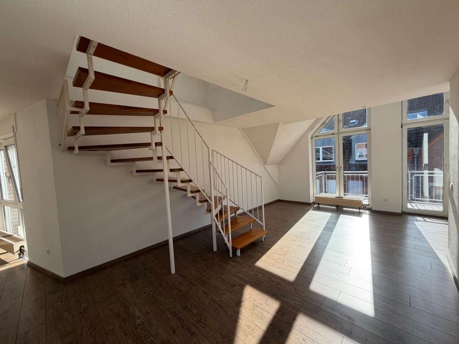 Die toll geschnittene Maisonettewohnung befindet sich am Rande des HannenCenters im Dachgeschoss eines Eckhauses. In der unteren Wohnebene befinden sich das Wohnzimmer, die offene Küche sowie die Diele und das Gäste-WC. Ein Highlight ist hier die große Dachterrasse, nahezu uneinsehbar und der zweite Balkon, der sich ebenfalls an den Wohnbereich anschließt. In der zweiten Wohnebene befinden sich das Schlafzimmer, ein Kinder- oder Arbeitszimmer sowie das Bad mit Wanne, Dusche und Veluxfenster.