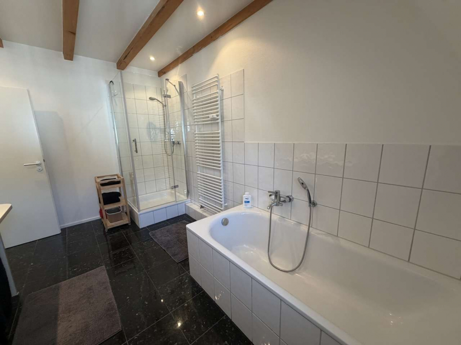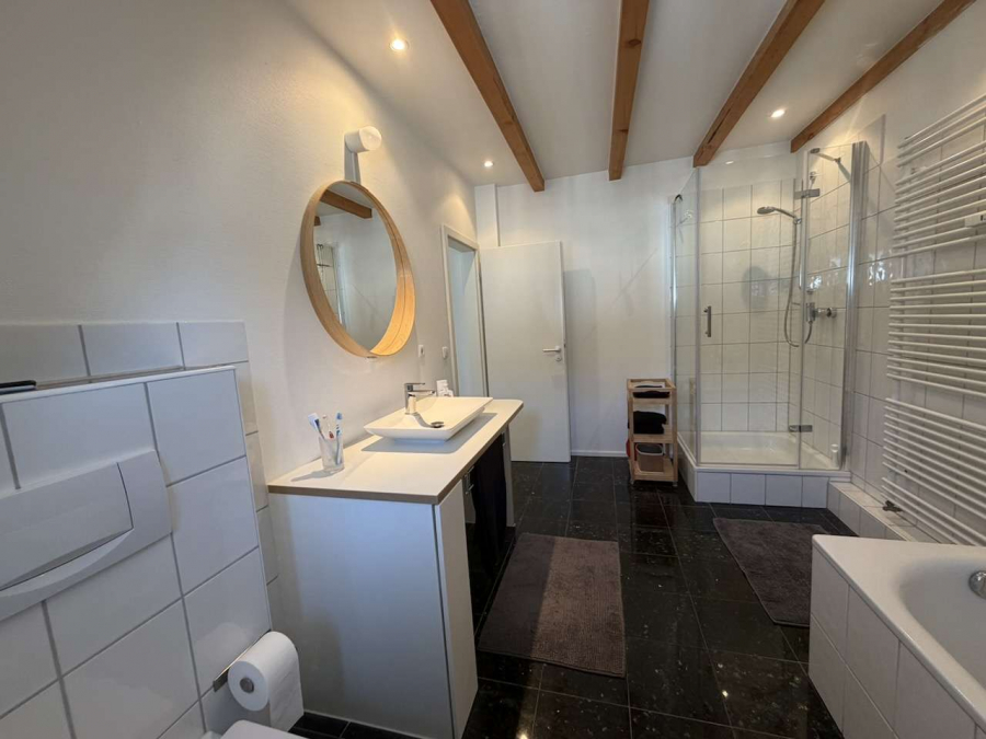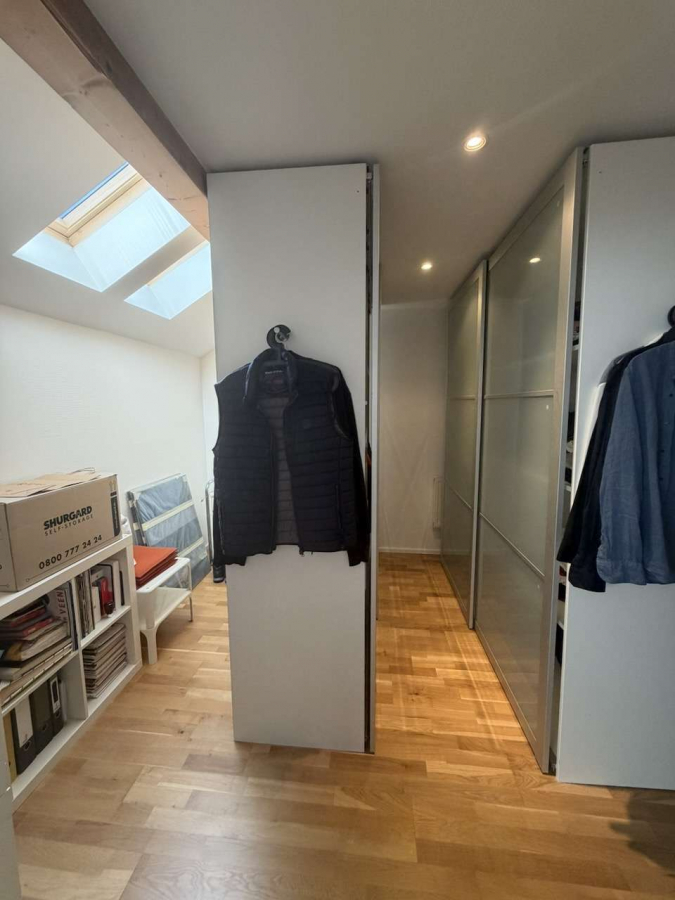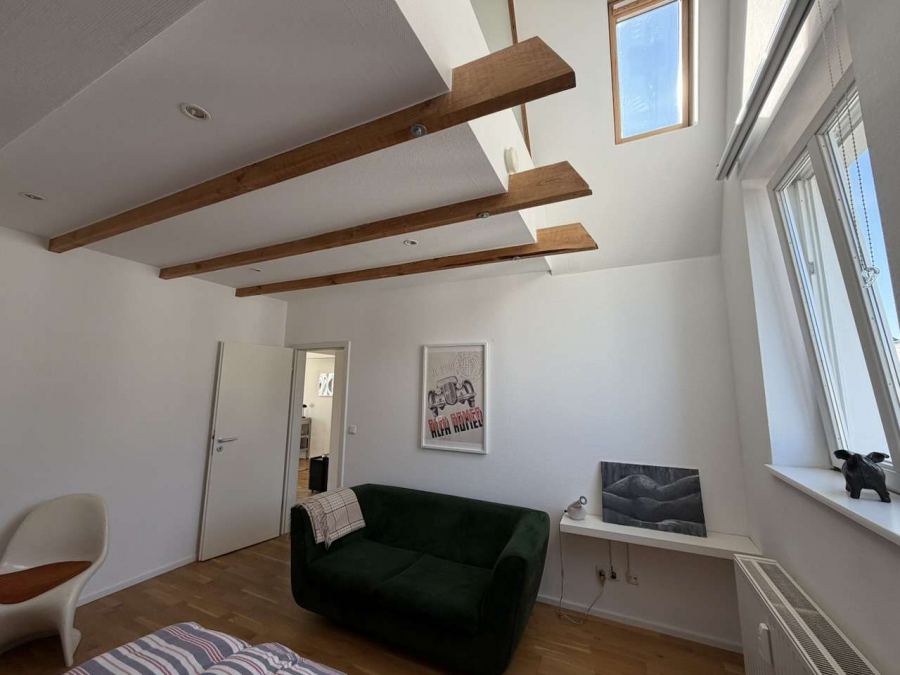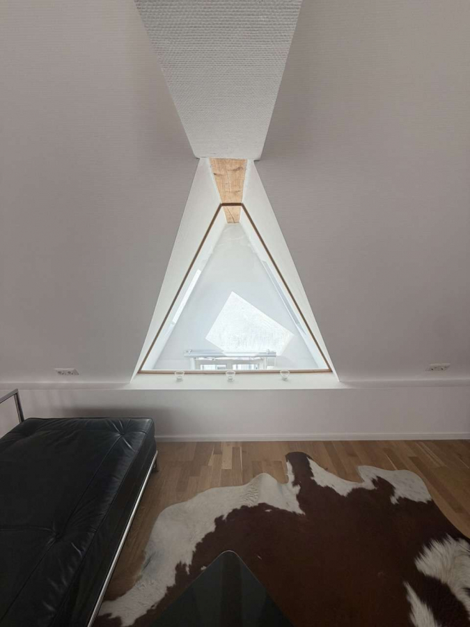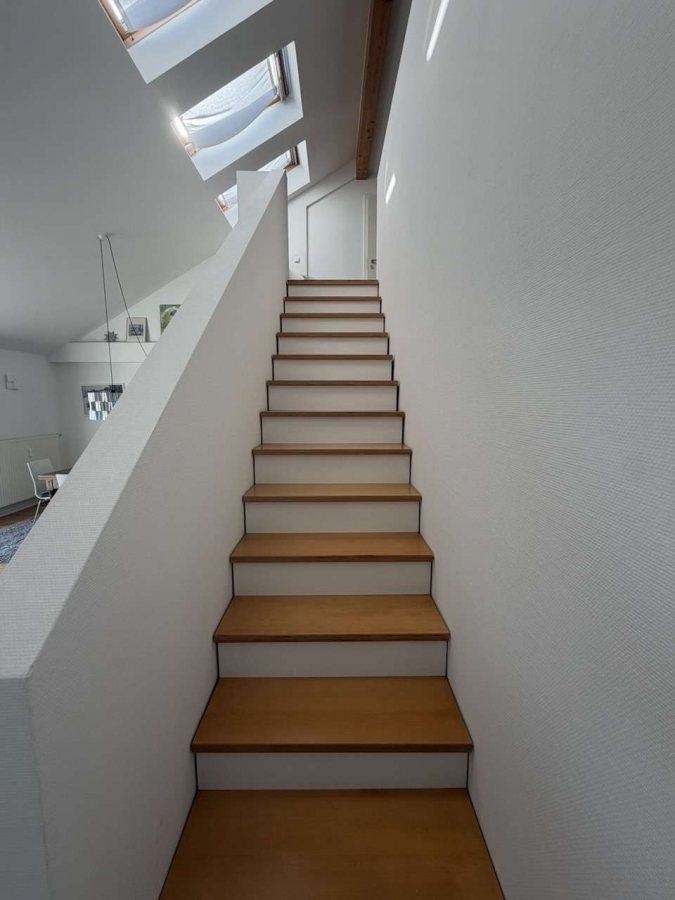Die offene Empore, welche über eine gerade Holztreppe erreicht wird, verleiht der Wohnung eine besondere architektonische Qualität. Von hier aus eröffnet sich ein beeindruckender Blick in den Wohnraum. Ergänzt wird dieser Bereich durch eine abgetrennte Ankleide, die Funktionalität und Wohnkomfort ideal miteinander verbindet.