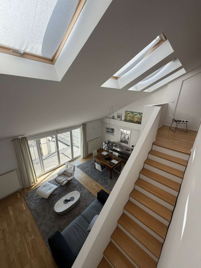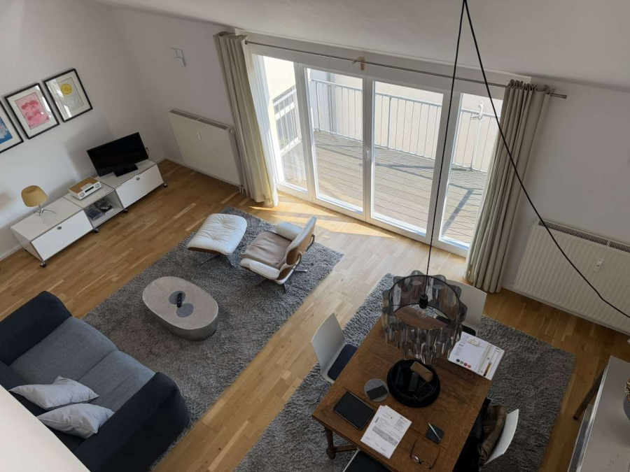 Die Wohnung erstreckt sich über zwei Ebenen und überzeugt durch eine offene, großzügige Raumgestaltung. Die Wohnebene bildet das Herzstück der Wohnung und bietet einen lichtdurchfluteten Wohn- und Essbereich mit offener Küche. Hier entsteht ein modernes, kommunikatives Wohngefühl mit gleichzeitig gemütlicher Atmosphäre. Ein Balkon mit weiter Sicht rundet das Wohnangebot ab und schafft einen angenehmen Rückzugsort im Freien.
